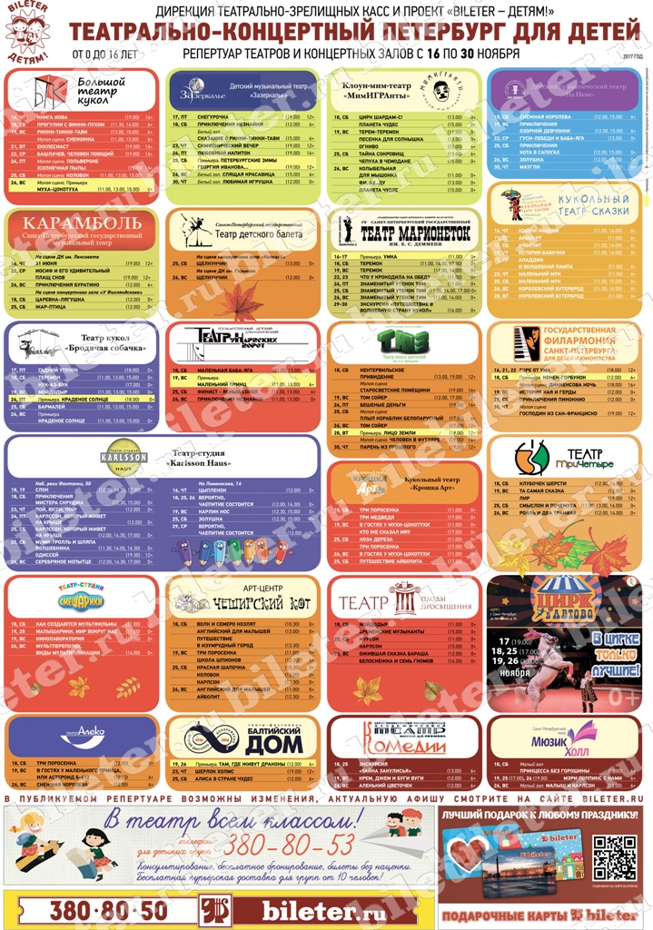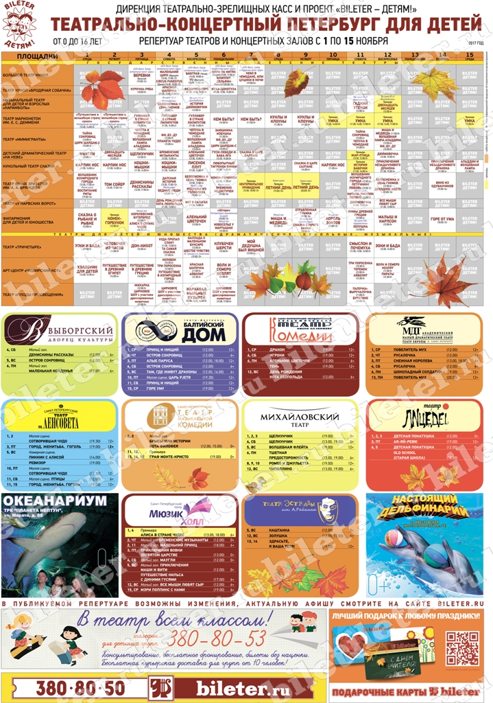 Уважаемые родители! В соответствии с достигнутой договоренностью между Комитетом по Культуре и Комитетом по образованию, ООО «Дирекция театрально-зрелищных касс» ежемесячно осуществляет выпуск афиши «Театрально-концертный Петербург для детей», который содержит информацию о городских мероприятиях, ориентированных на детскую аудиторию. Так же ООО «Дирекция театрально-зрелищных касс» осуществляет организацию групповых посещений учениками образовательных учреждений начального и среднего образования театральных, цирковых и музыкальных представлений, предоставляет бесплатное бронирование и курьерскую доставку билетов для детских групп. Позвонив по контактным телефонам, указанным ниже, можно получить полную информацию о детских мероприятиях, проходящих в городе, о репертуаре, жанре, специалисты помогут подобрать спектакль в соответствии со школьной программой. Специальные условия, предоставляемые детским группам от 10 человек: • Бесплатное бронирование • Реализация билетов по номиналу • Бесплатная курьерская доставка Единый телефон заказа +7 (812) 380-80-53 (доб. 1), +7 953 379 22 87 Вся информация для педагогов и родителей размещена на вкладке сайта https://www.bileter.ru/page/pedagogam_i_roditelyam